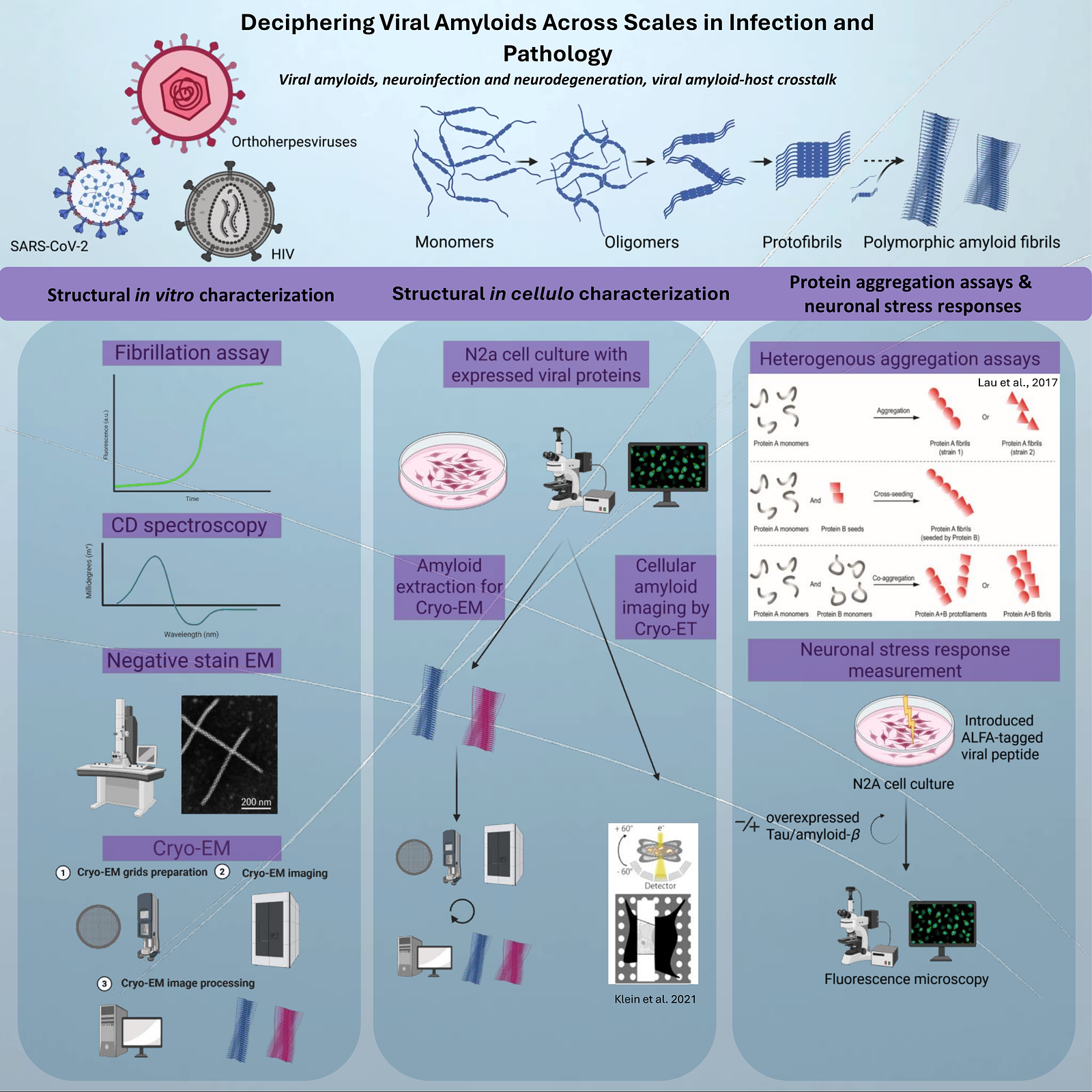Amyloids, long regarded as disease-linked aggregates, serve functional roles in biology, including viruses, yet molecular insights remain limited. In this project, I lays the foundation to decipher the viral-host amyloid crosstalk by characterizing amyloid-prone targets across viral families using structural, biochemical, and cellular approaches. Focusing on neurotropic viruses, I assess whether viral targets cross-aggregate tau/Aβ and trigger neuronal stress, offering mechanistic evidence for the neuroinfection-neurodegeneration link and guiding therapies against infection and neurodegeneration.  Currently, I have several fibrillating target structures of different viruses which are in the in vitro characterization stage, while having set-up  the conception of the in cellulo characterization.